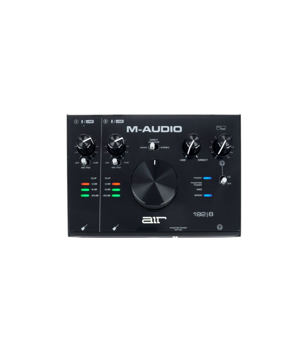 Cu AIR 192 | 8, puteți crea înregistrări de calitate de studio pe 24 de biți / 192kHz cu o interfață audio intuitivă și ușor de utilizat. Intrările flexibile ale AIR 192 | 8 vă permit să înregistrați până la 2 canale simultan, cu cele două intrări combinate XLR + ¼” balansate cu o memorie micro-10dB comutabilă și 2 intrări nou-instrument de ¼” care au un gain special conceput și stadiul impedanței pentru a oferi cea mai precisă reprezentare a unei chitare sau a unui bas conectat direct la interfață. Ieșirile (2) ¼ ” și (4) RCA cu control USB / Direct și comutatorul Mono / Stereo Direct oferă multiple opțiuni de ieșire pentru conectarea la uneltele de bord, mixerele DJ sau monitoarele de studio. Ieșirea căștilor cu nivel independent, USB / Direct și controale de flux audio 1/2 sau 3/4 comutabile sunt perfecte pentru a asculta discret un mix cue, sub-mix sau mix principal. Conexiunile MIDI In si Out sunt incluse pentru conectarea sintetizatorilor, a secvențiatorilor și a angrenajului MIDI extern.