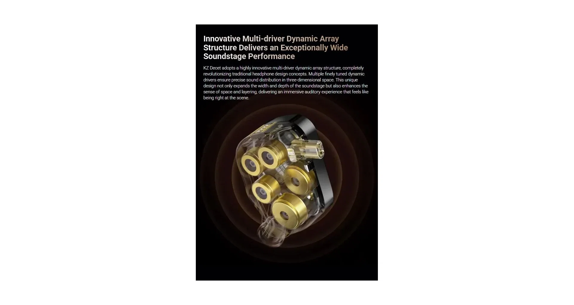 Castile KZ Decet produc un sunet clar, spatial, detaliat si echilibrat printr-o arhitectura acustica cu 10 drivere dinamice bilaterale si un crossover electronic precis cu 3 cai. Bass-ul este complet si controlat, fara a afecta claritatea celorlalte frecvente. Sunetul este transparent, cu un soundstage larg si detalii bine conturate. Constructia 3D din rasina de calitate medicala 3D si designul cu cablu detasabil completeaza un pachet gandit pentru atat pentru profesionistii din domeniul audio, muzicieni, cat si pentru audiofili. Varianta Decet Tuning include comutatoare pentru personalizarea raspunsului in frecventa.